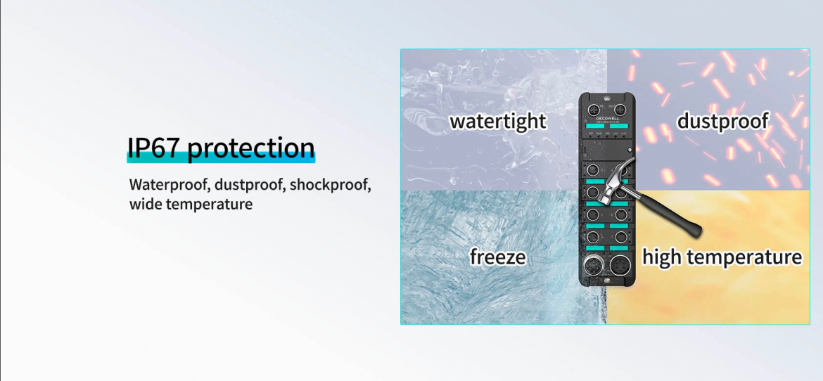 In the realm of industrial automation, reliability and resilience are paramount. DECOWELL’s IP67 modules, to be more specific, IP67 I/O module, stand out as robust solutions designed for demanding environments. With an IP67 protection rating, these modules excel in resisting water, dust, and impact, ensuring stable operation even in harsh conditions.