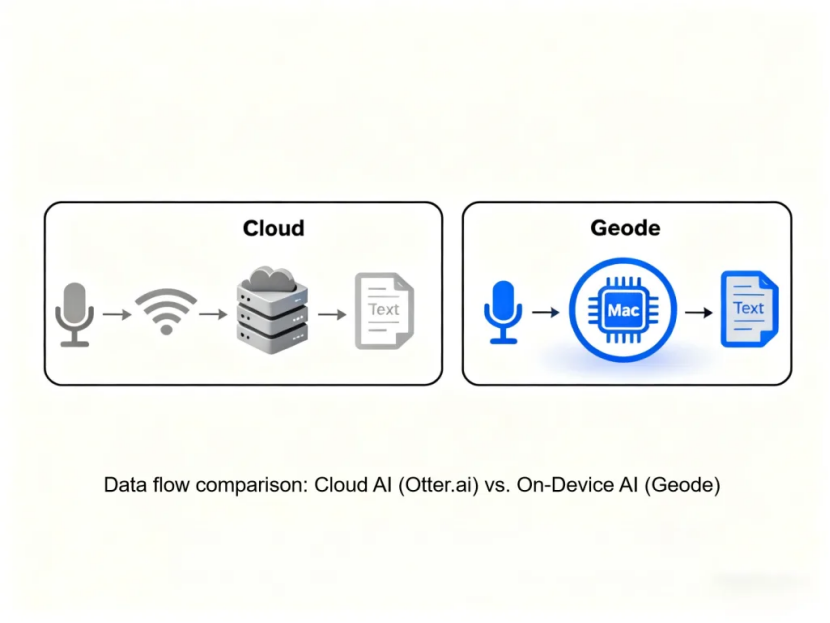 If you want a side-by-side technical breakdown, we’ve published a detailed architecture comparison of Geode vs Otter.ai that maps how cloud-based and on-device processing differ step by step. This article focuses on what those architectures imply for confidential work.