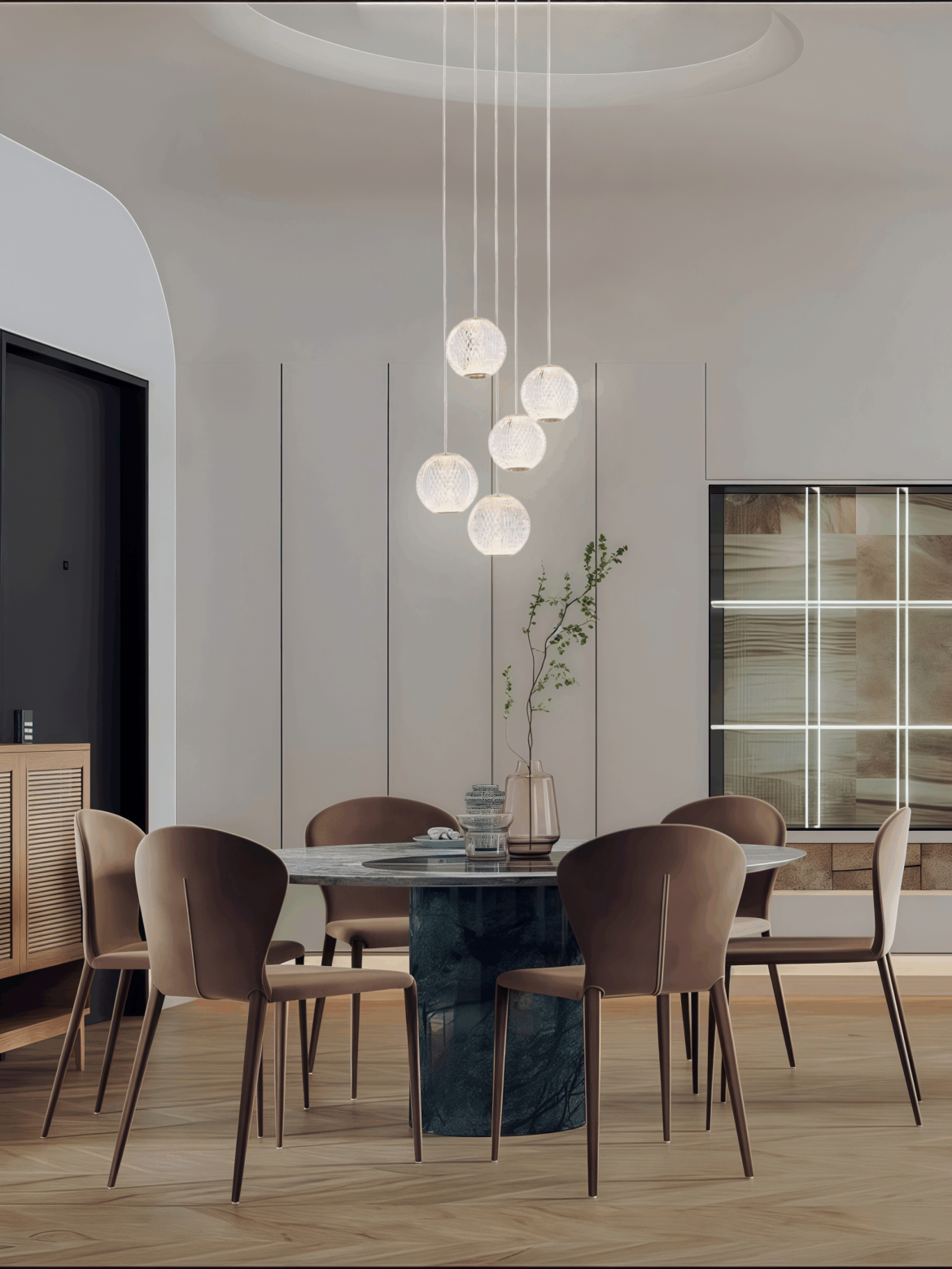 The most classic and widely appreciated application of a 5 light pendant light is its elegant suspension above a dining table, where it serves both a functional and aesthetic purpose. Professionals in the field of interior design adhere to a well-established rule of thumb: the fixture should be hung approximately 30 to 36 inches (75 to 90 cm) above the table surface. This specific height is meticulously chosen to create an intimate and inviting pool of warm light, which is generously provided by the fixture’s 3000K LED source. This warm glow not only enhances the ambiance of the dining area but also ensures that sightlines between guests remain unobstructed, fostering a sense of connection and conversation. With a diameter of 32 cm, the Diamond Acrylic pendant is meticulously designed to be perfectly scaled for round dining tables, where it can serve as a stunning focal point, or for intimate booth seating arrangements in boutique hotels, adding a touch of sophistication and luxury. The pendant’s spherical acrylic heads are not merely functional; they act as exquisite prisms, skillfully casting a sophisticated and intricate pattern of light across the dining space. This pattern not only enhances the overall dining experience but does so without causing any discomforting glare, ensuring that the ambiance remains both elegant and comfortable for all diners. The thoughtful design and precise engineering of the Diamond Acrylic pendant make it a versatile and indispensable element in creating a memorable and enjoyable dining atmosphere.